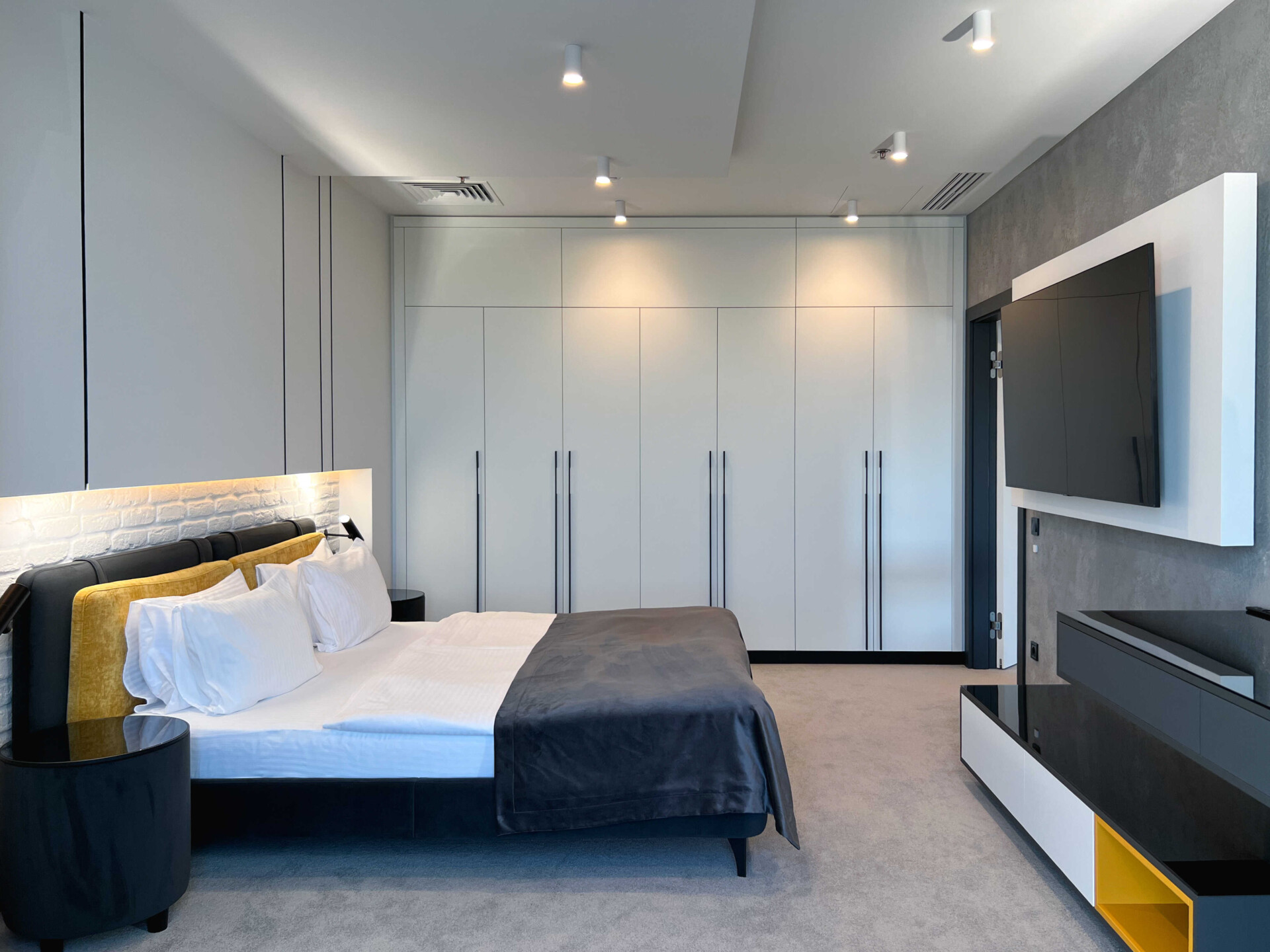 Великий двокімнатний номер з двоспальним ліжком. Розмір ліжка 1,8 м X 2,0 м. Загальна площа номера: 75 кв.м.